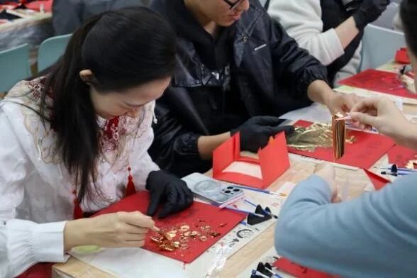 1月23日上午, porncams 教职工之家举办了一场别开生面的“迎新春——非遗手作金箔画体验活动”。传统金箔技艺与新春的喜庆氛围完美融合,为师生们带来了一场充满创意与温情的文化体验。学院领导、老师与留校学生欢聚一堂,以薄如蝉翼的金箔为笔墨,精心制作出一幅幅寓意吉祥的马年主题金箔画作品。
