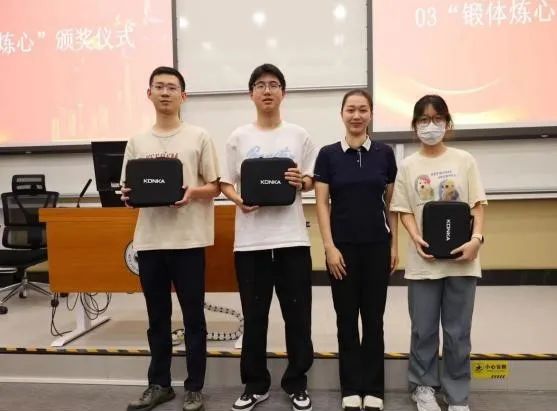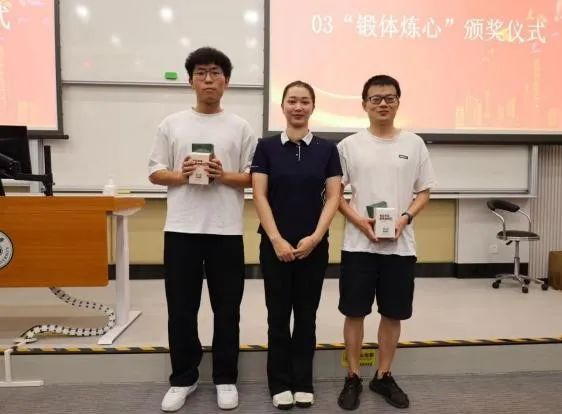 最后,袁婷书记做总结,学院以体育社团为基石,各社团错位发展,篮球主团队协作,足球主竞技拼搏,乒乓球主灵活应变,羽毛球主敏捷反应,学生在多元的体育运动中学会了如何面对挑战、如何坚持不懈、如何团结协作,学院营造起“热爱运动、健康快乐、自信拼搏”的文化氛围。未来将深化体育与德育、智育等融合,进一步激发学生活力,学会如何在逆境中坚定信念,提高学习生活的积极性和意志力,培育更多全面发展的人才,为国家输送高素质人才。活动现场为“锻体炼心”活动获奖者颁发奖品。