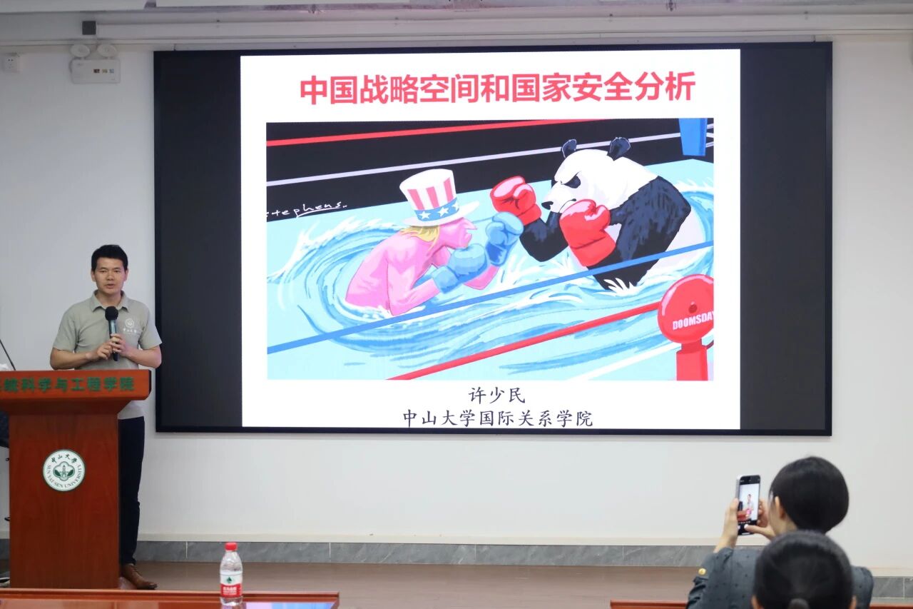 仪式伊始,许少民副教授为学员讲授《中国战略空间与国家安全分析》。他紧扣总体国家安全观,结合《国家安全法》与全球安全倡议,辨析消极安全、积极安全的核心差异,拆解中国五圈层战略空间布局,深入解读“一带一路”倡议价值与中美战略竞争格局。他以现实案例引导青马学员树牢国家安全意识,以青年担当守护国家主权、安全与发展利益。