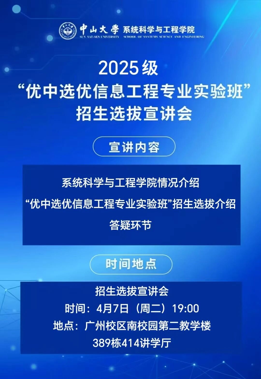 为保障系统工程总体性人才生源质量,培养复合型信息工程创新人才,现启动2025级“优中选优信息工程专业实验班”招生选拔工作,相关事宜通知如下: