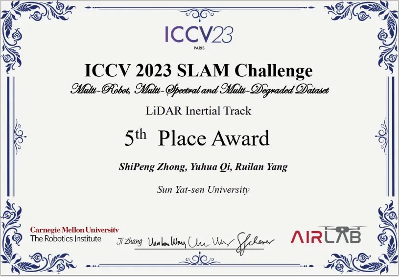 2023年10月,“ICCV 2023 年SLAM挑战赛”结果揭晓, porncams 学子组成的鹏舆战队在比赛中荣获团体奖(入围比赛榜单的前五名-共29支参赛队伍),并受邀在ICCV SLAM研讨会上介绍了团队设计的算法。