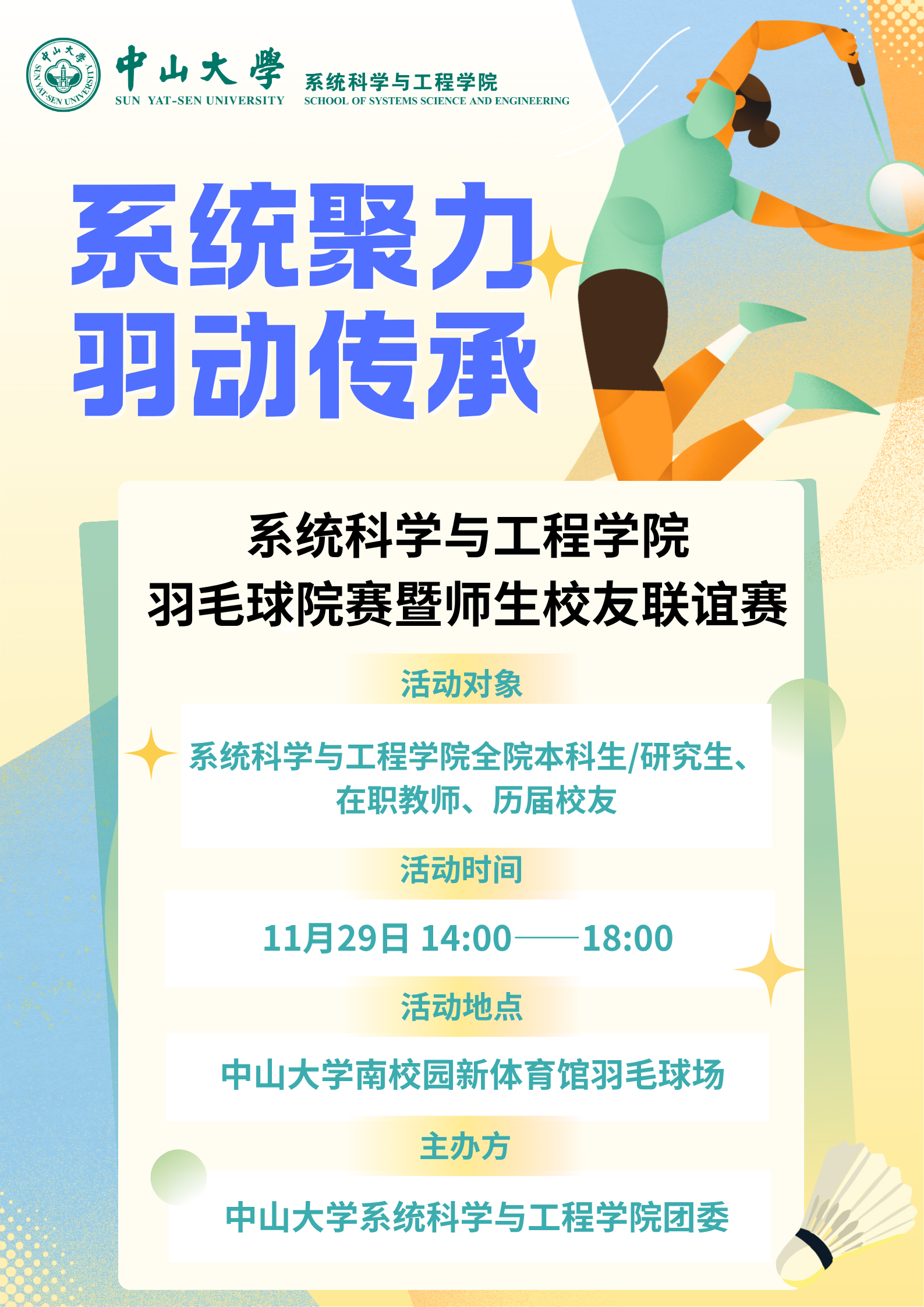 本届院赛以“系统聚力·羽动传承”为主题,不仅是一场体育竞技,更是一次系统院人跨越年级、跨越届别的温情重聚。我们期待通过羽毛球这项深受师生校友喜爱的运动,搭建一个交流互动的平台,让在校生感受师兄师姐的风采,让校友重温母校情怀,让师生情谊在切磋中得到升华。